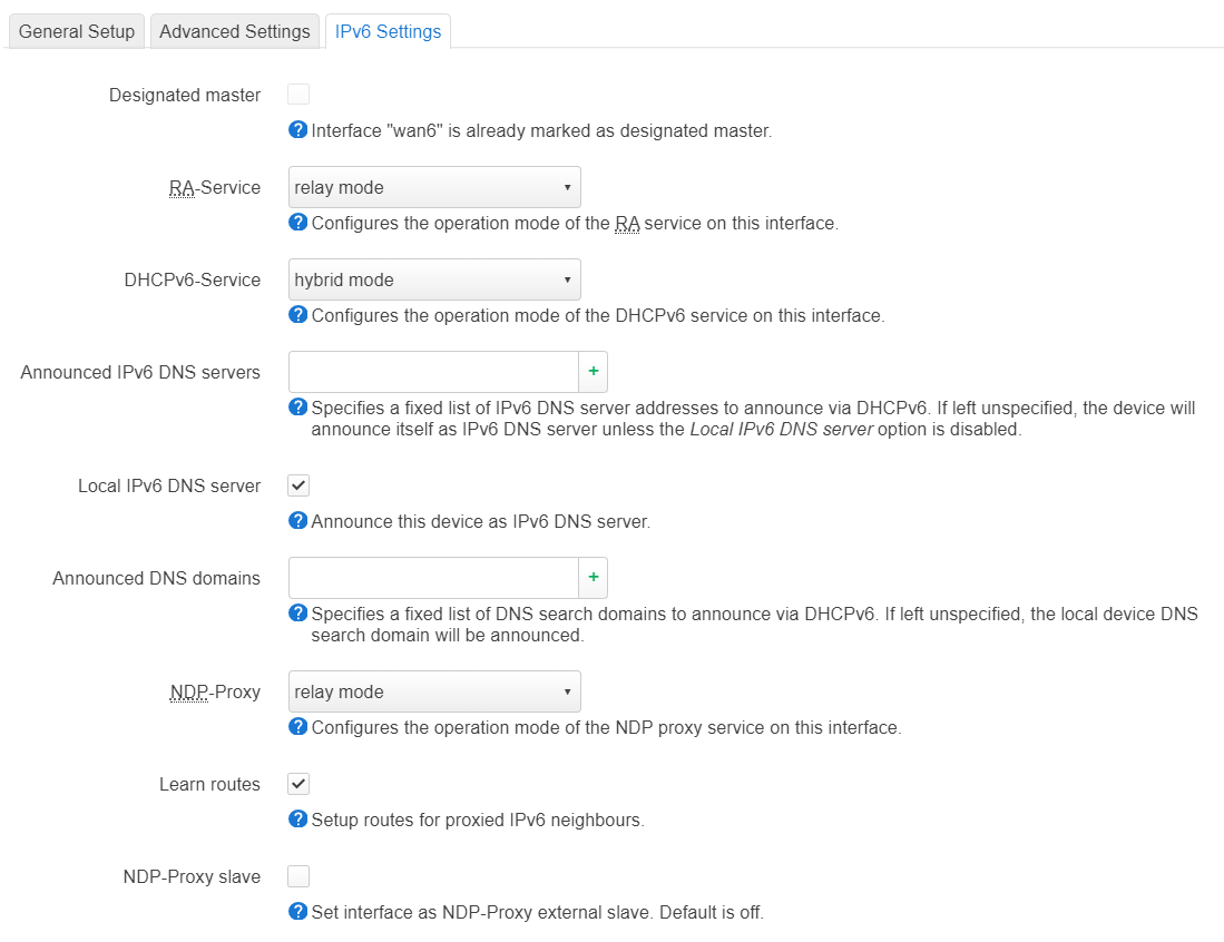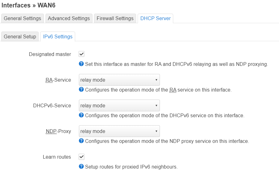 ipv6 settings:Designated master:打勾RA-Service、DHCPv6-Service、NDP-Proxy全部设置为relay modeLearn routes:打勾- Save 保存