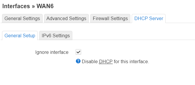 wan6->edit->dhcp servergeneral setup:Ignore interface:打勾