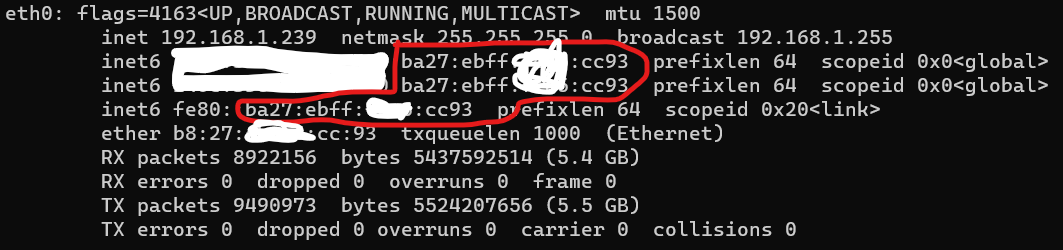 ipv6 一般是运营商会分配/48,并且重播后会发生变化,经过路由器dhcp后,终端获取的是 /64,剩下的64位,如果是使用 EUI-64 无状态配置的话,那么后面64位是根据mac地址计算出来的。如下图,我的树莓派后面几位都是相同的,并且结尾的4位和mac地址结尾4位一样。