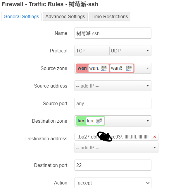 ::{你复制的结尾}/::ffff:ffff:ffff:ffff(按1中假设,结果就是::aaaa:bbbb:cccc:dddd/::ffff:ffff:ffff:ffff) - destination port 就是需要放行的端口了,按需填,不填默认全部放行